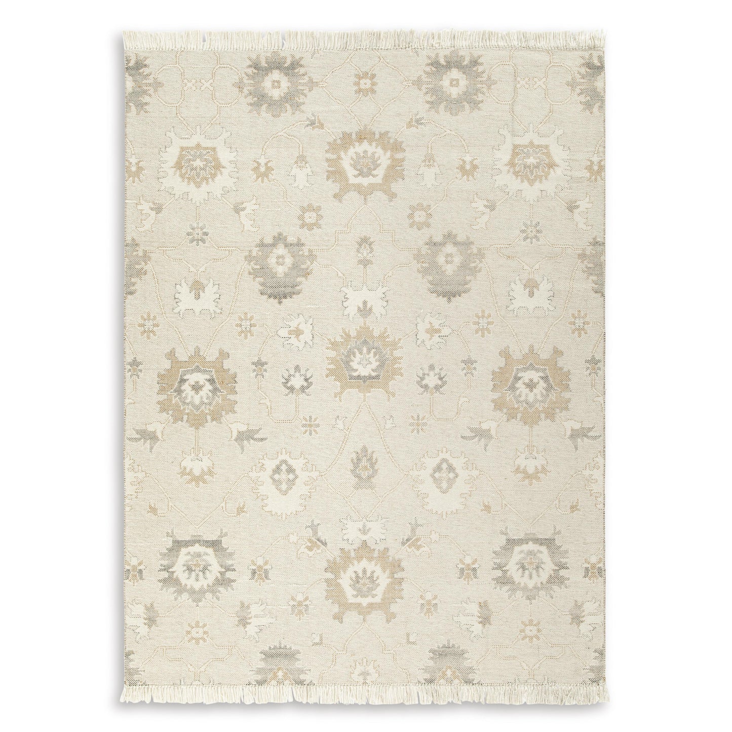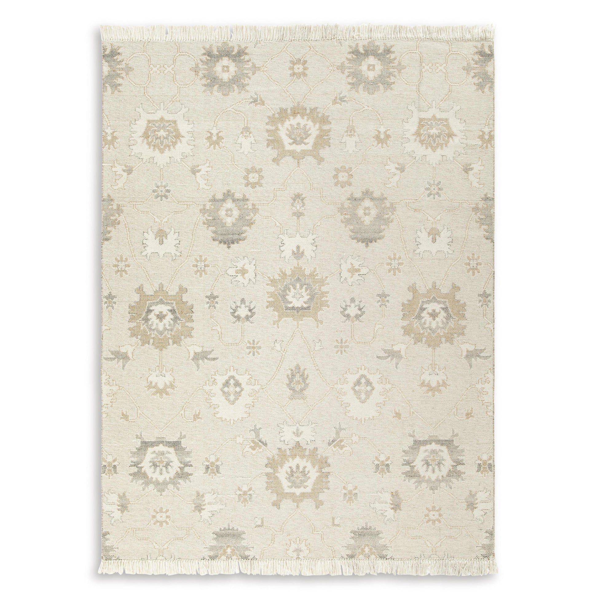 Bring modern life into balance with the rhythms and beauty of nature. This area rug has the vintage look of an heirloom. Blooming with graceful florals in neutral tones and surrounded by fringe edging, it adds style to any lounge space.