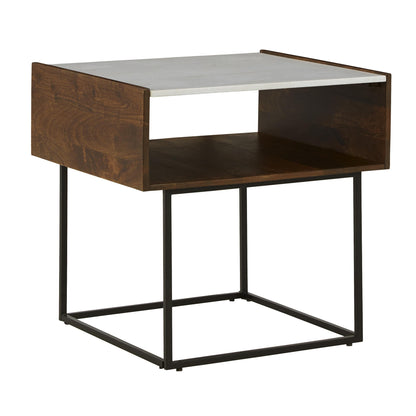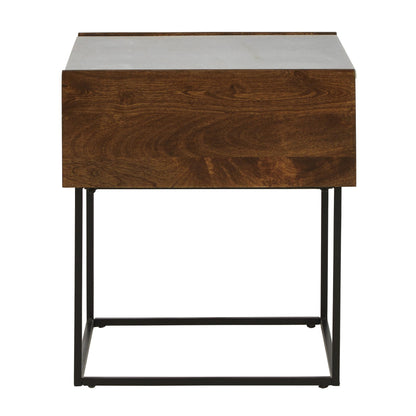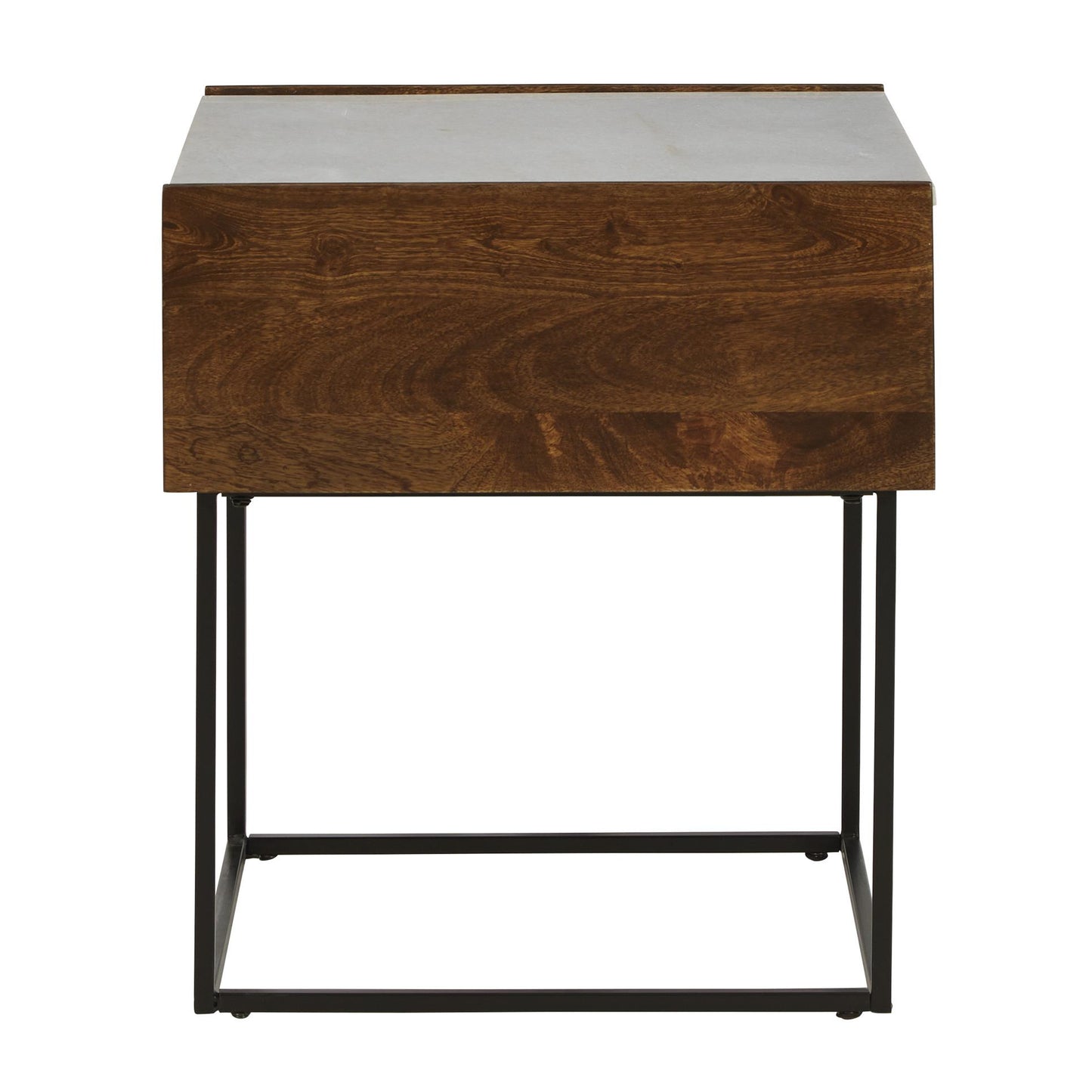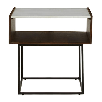A posh and polished look for a contemporary aesthetic, this striking end table features solid mango wood, a natural marble tabletop and a slim metal base. Designed with an open cubby shelf for extra storage, this beautiful table easily complements modern seating arrangements.