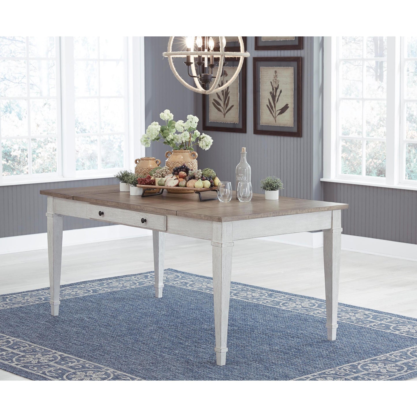 Set the scene for coastal chic or modern farmhouse living with this dining room set. Clean-lined, simply striking table doubles the charm with a brown tone top with plank effect, paired with a grayish white base with rub through effect for timeworn appeal. Two convenient side drawers and a lift-top bin offer abundant storage options. The comfortably cushioned chair sports a grayish white finish with rub through effect for timeworn appeal. This set includes a table and six chairs.
