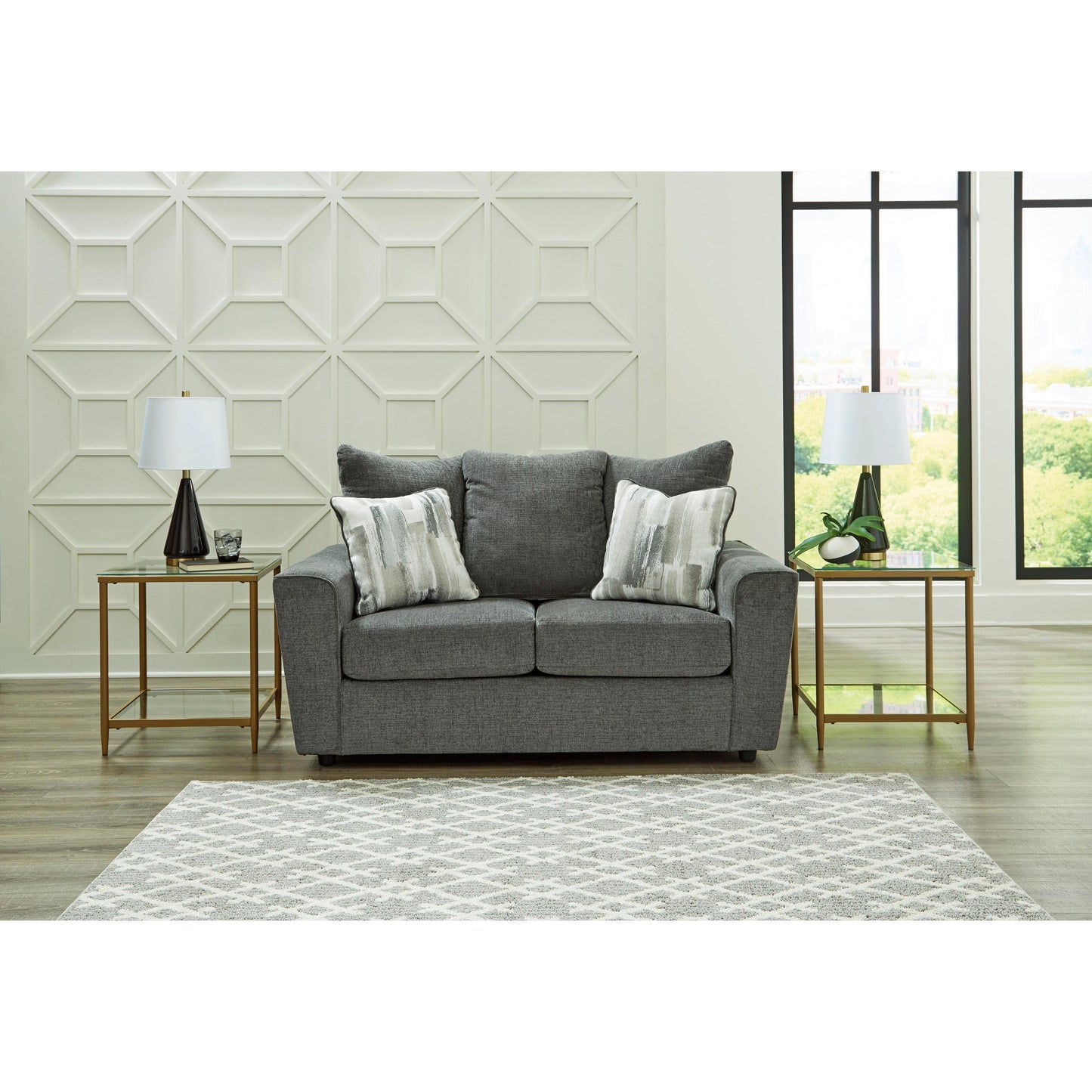 What’s new in neutrals? Shades of gray, of course. Embrace the sophisticated design trend with this gorgeous sofa and loveseat set, which offers a clean-lined, contemporary style at a comfortably cool price. Sure to lift your spirits, the plush chenille fabric is fabulously neutral. Contemporary flared arms give it a distinctive flair. This set also arrives with four cool brushstroke accent pillows to elevate the taste and comfort level.