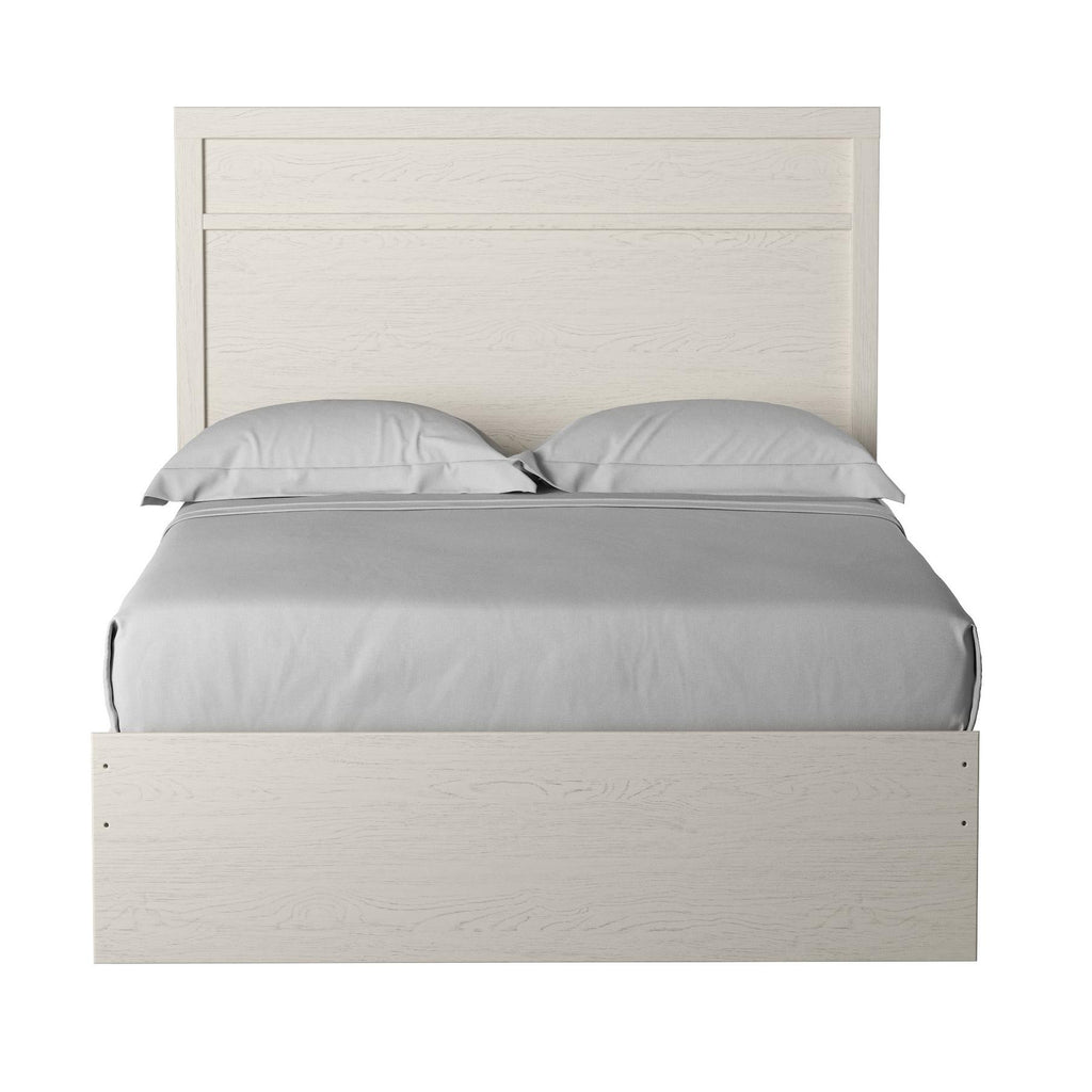 With its clean-lined look and modern attitude, this full panel bed is a fresh style awakening. A crisp, white hue over subtle replicated wood grain easily complements other furniture finishes. The simple, unadorned profile is given depth and dimension with the addition of plank-style moulding on the headboard—proof that beauty lies in the details.
