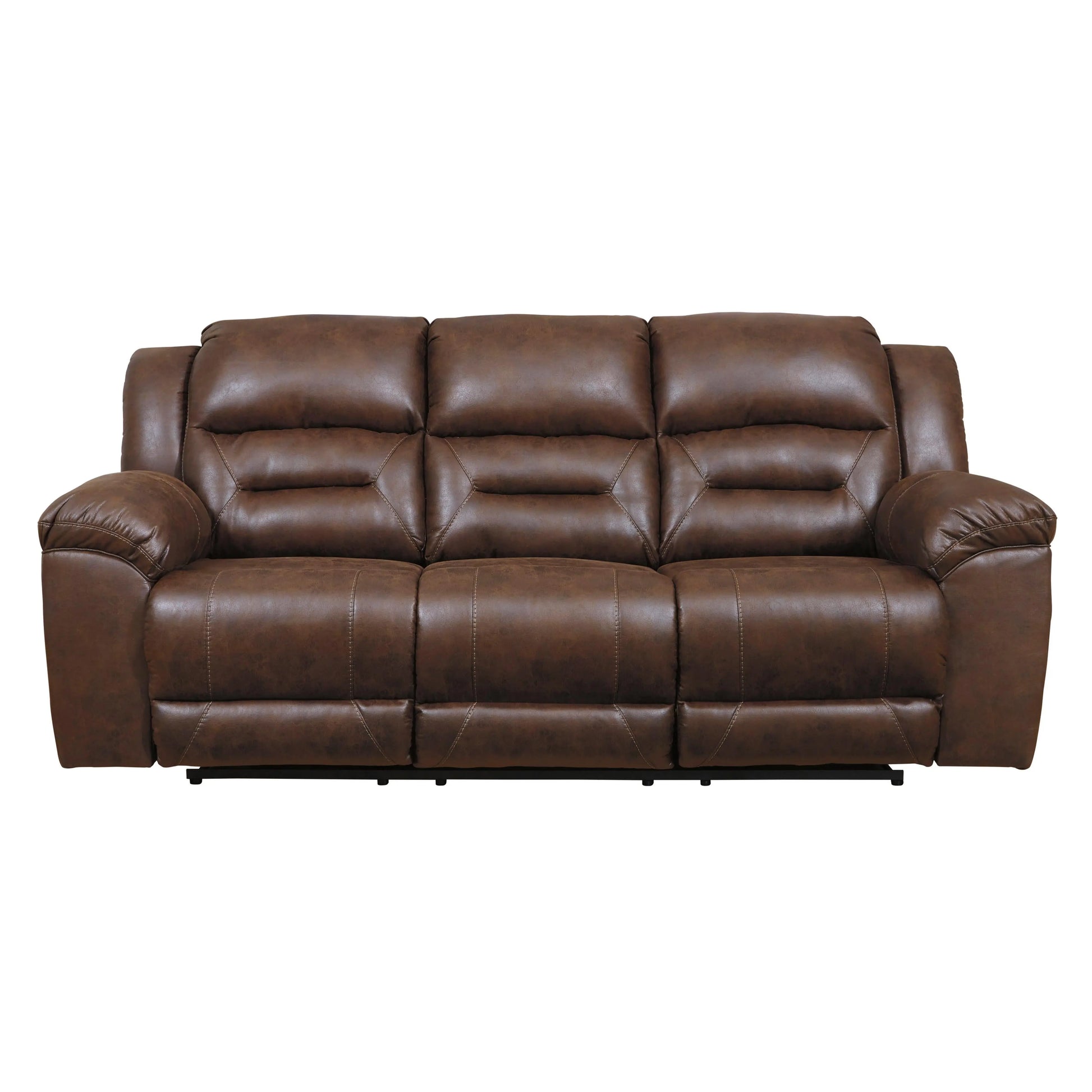 For those who love the cool look of leather but long for the warm feel of fabric, this reclining sofa delivers both with ease. Its high-performance padded faux leather is remarkably durable and easy to clean, making it just the thing for family spaces. Channel-stitched back cushions provide indulgent lumbar support for maximum comfort—not to mention fashion-forward flair.
