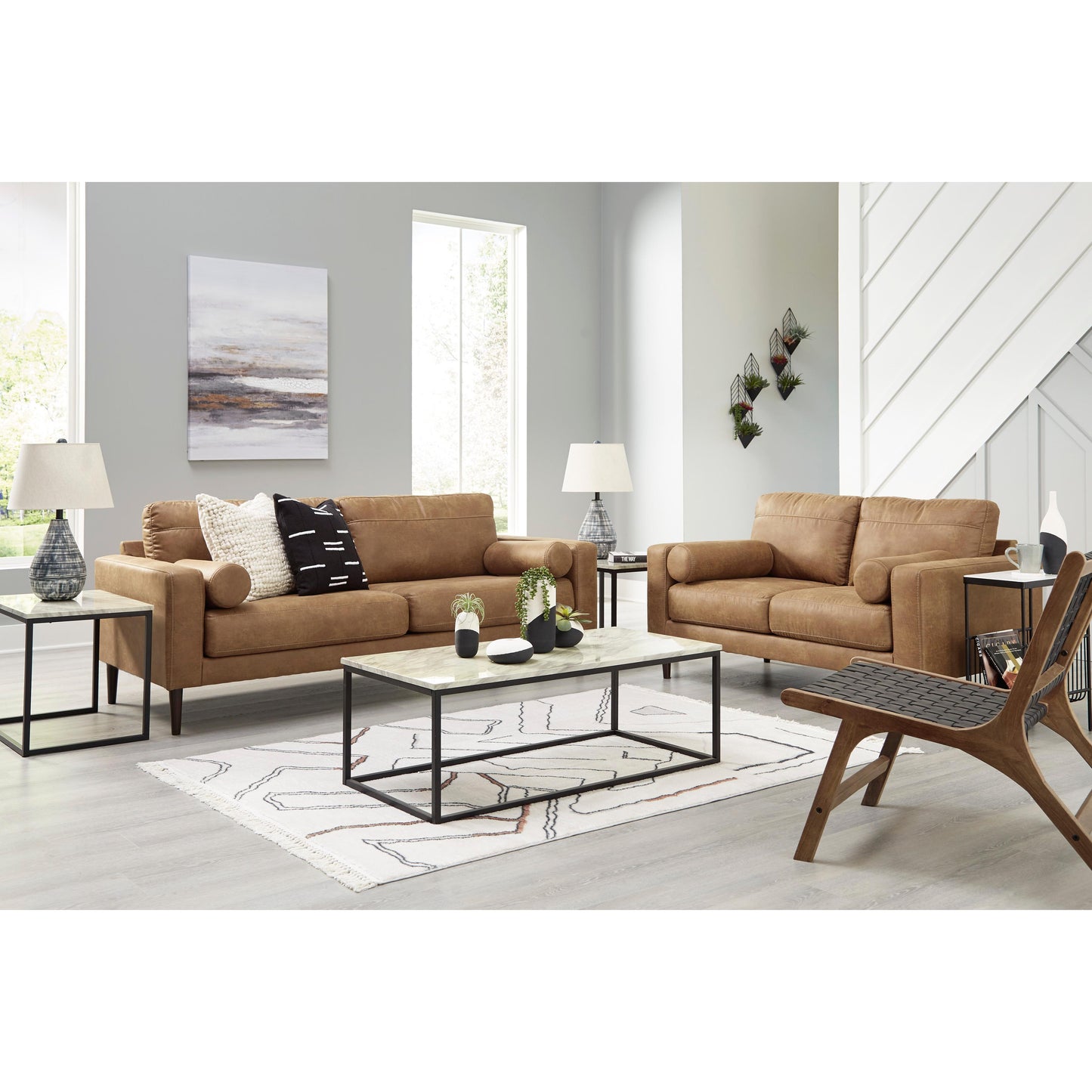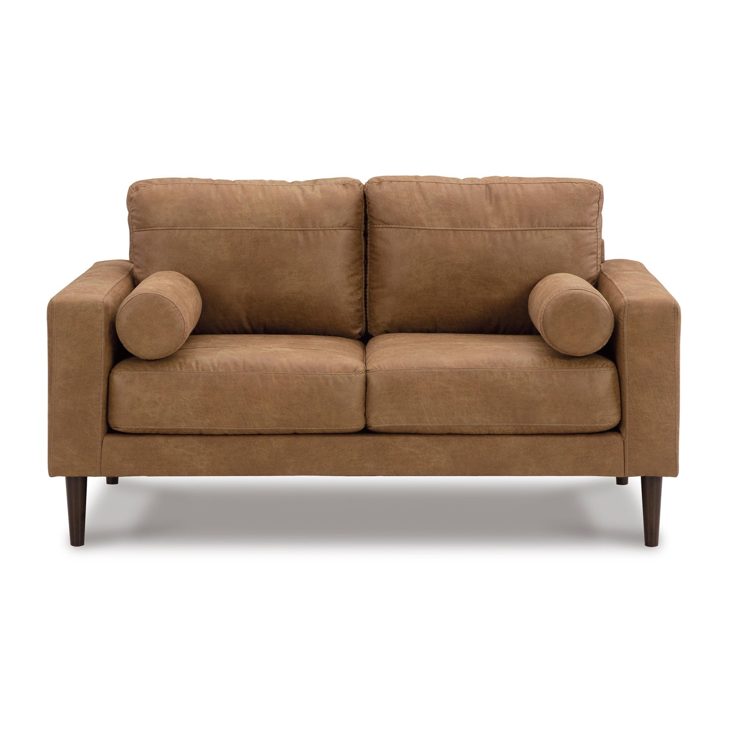 Small-scale style, tailored to perfection. This loveseat echoes retro aesthetics with warm caramel faux leather, while its ultra-linear silhouette incorporates a contemporary edge. Versatile in form and function, the seat suits styles from modern boho to transitional. And its size helps you to confidently curate your compact space without sacrificing comfort (or your budget).