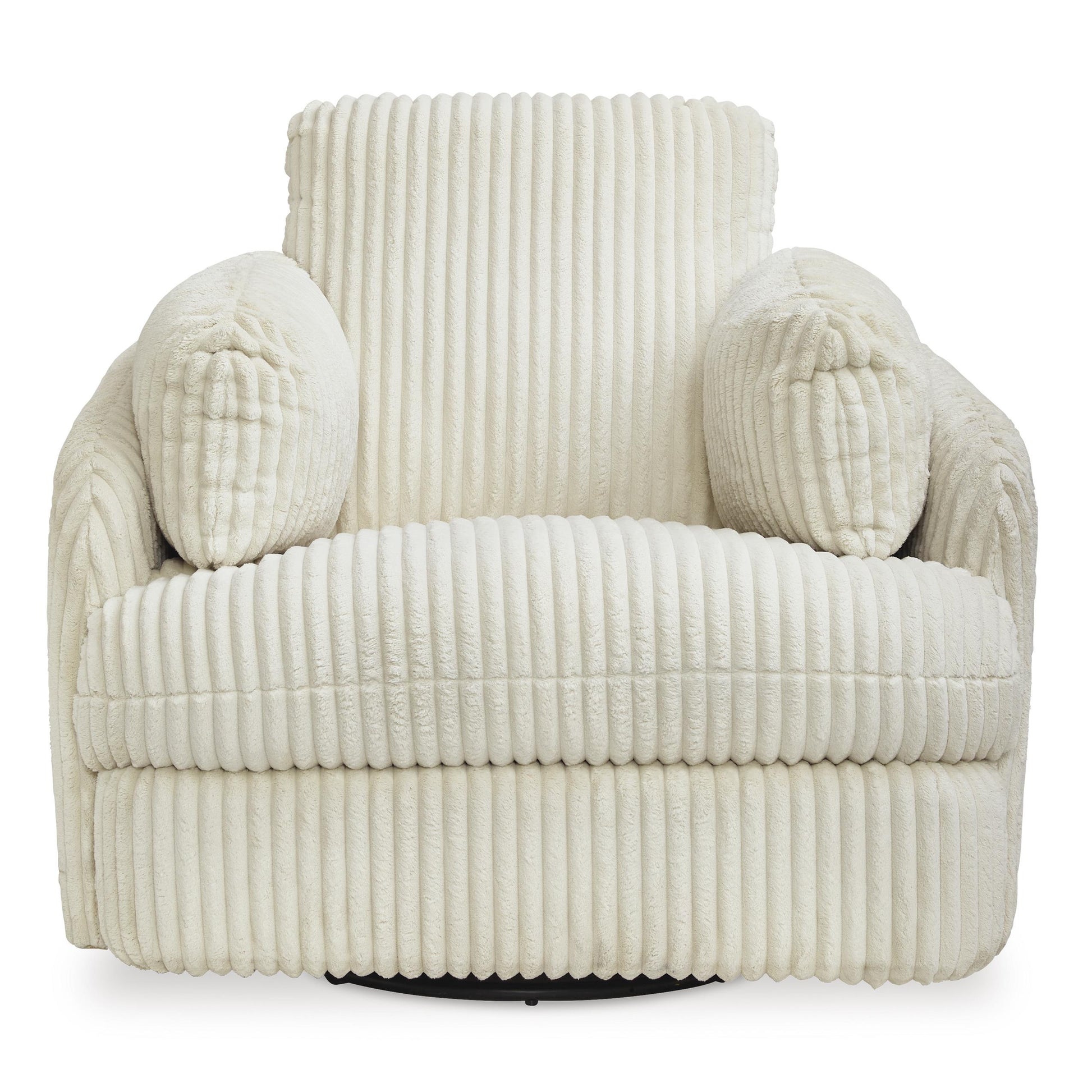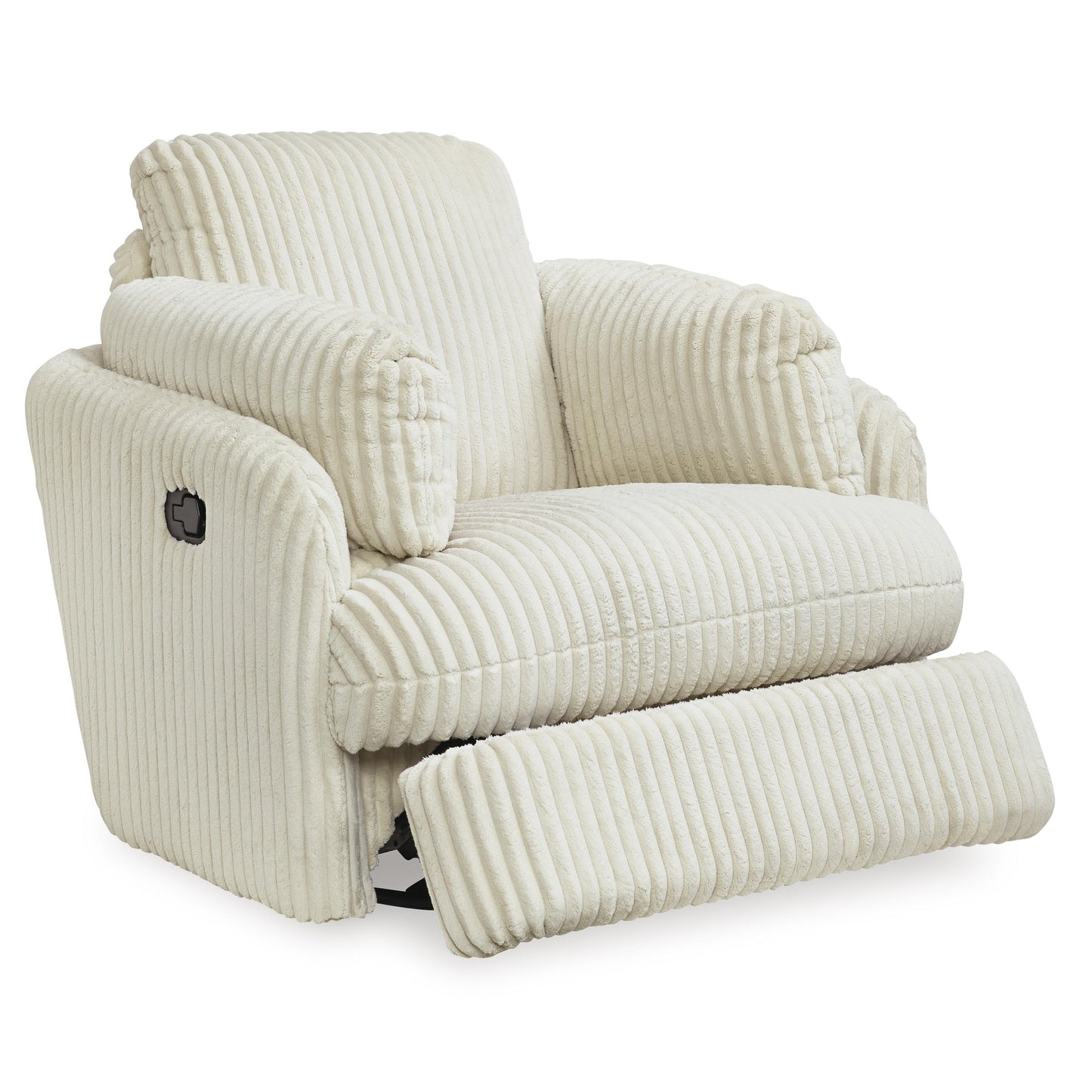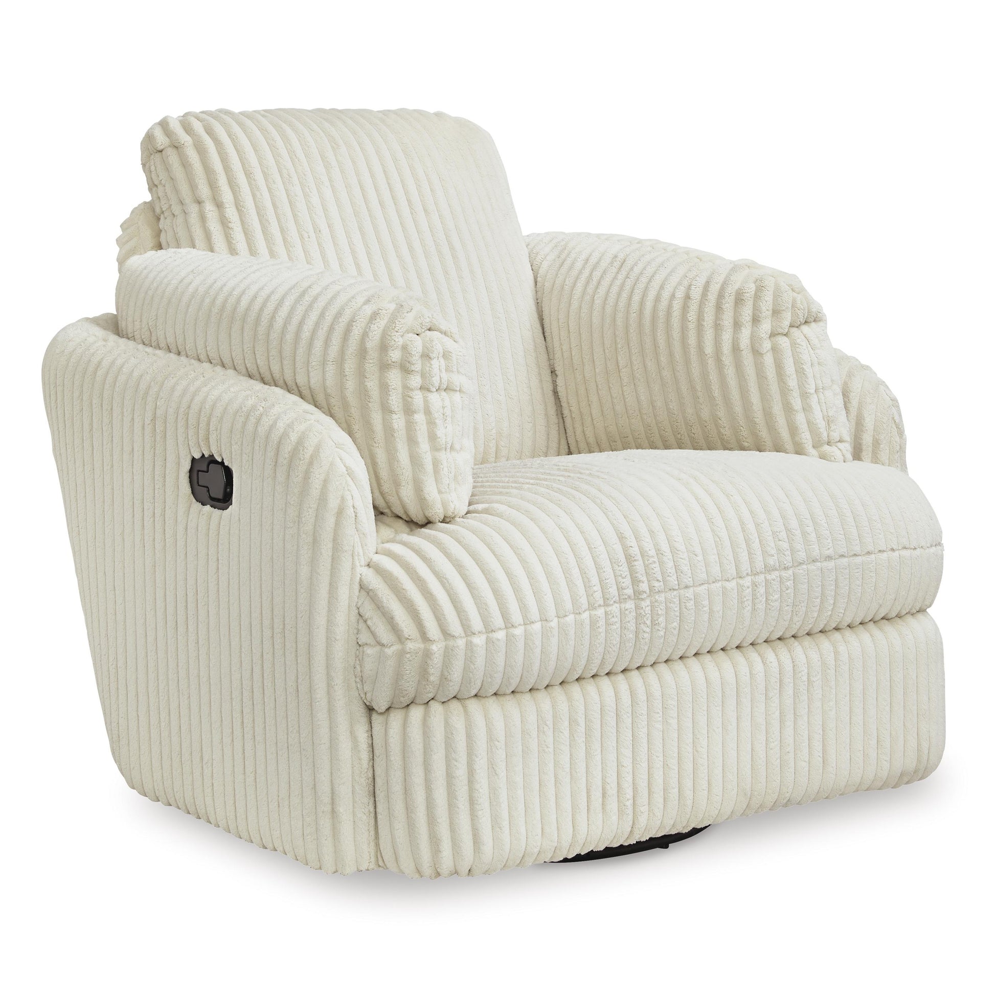 Like a warm hug, this recliner envelops you in comfort with its barrel shape and soft cord upholstery. It reclines, glides, and swivels to cater to your every need. This chair also features posh bolster pillows and cleverly designed storage. Unwind and cuddle up in your new cozy place.