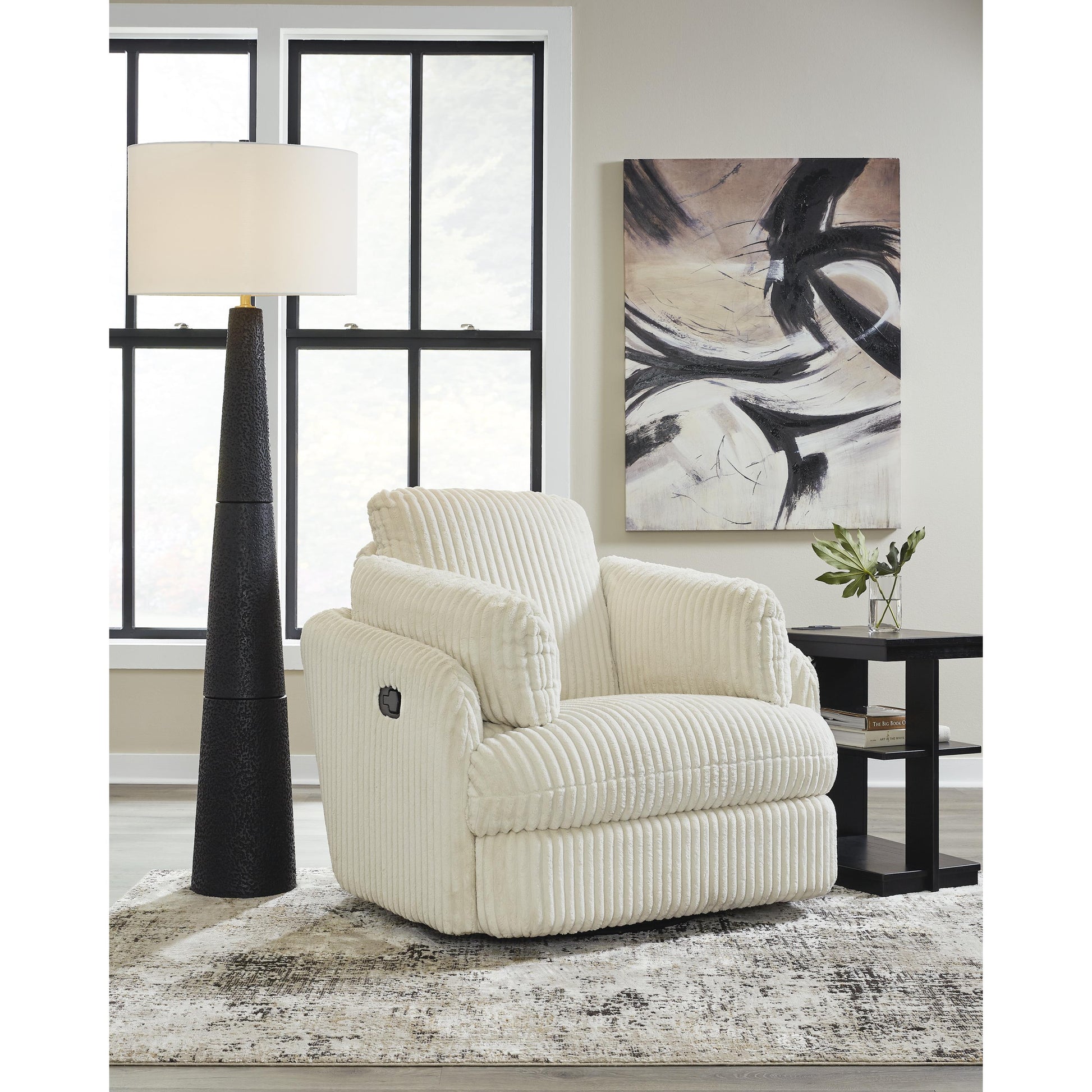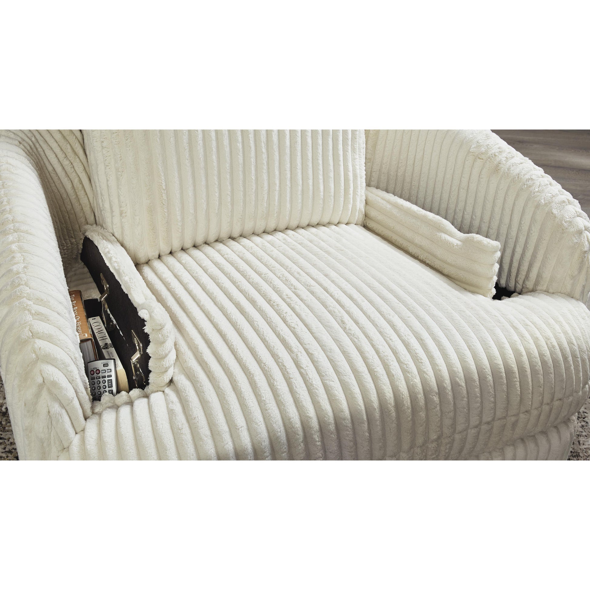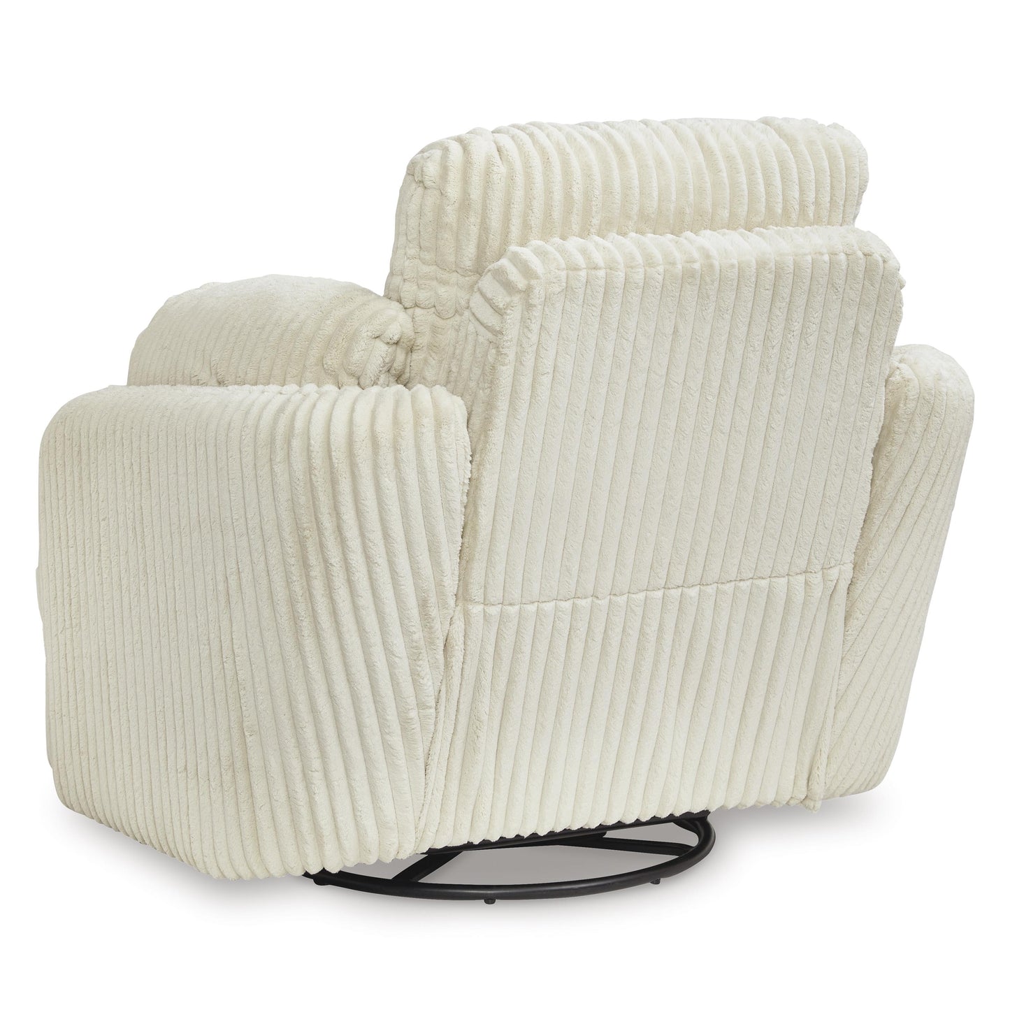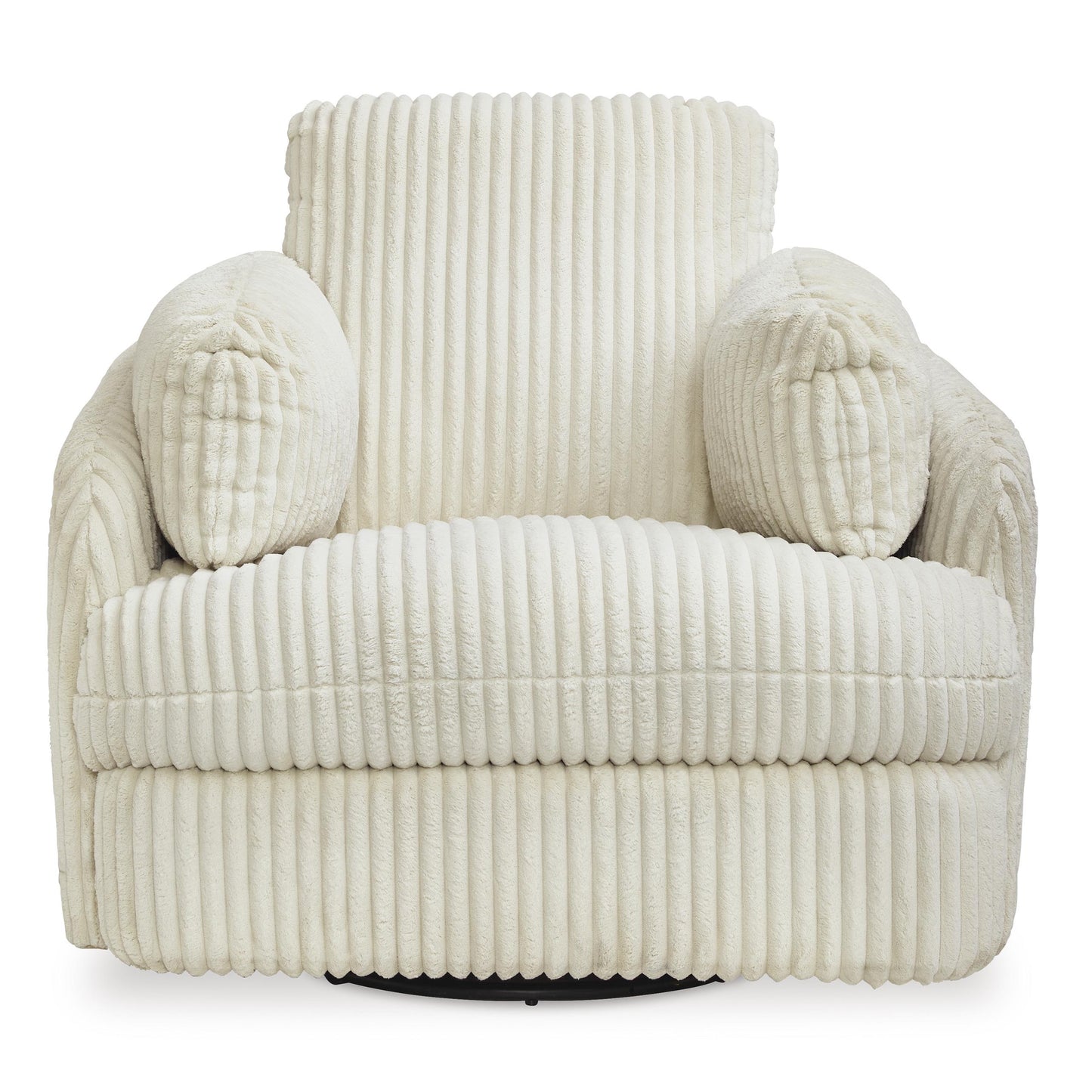 Like a warm hug, this recliner envelops you in comfort with its barrel shape and soft cord upholstery. It reclines, glides, and swivels to cater to your every need. This chair also features posh bolster pillows and cleverly designed storage. Unwind and cuddle up in your new cozy place.