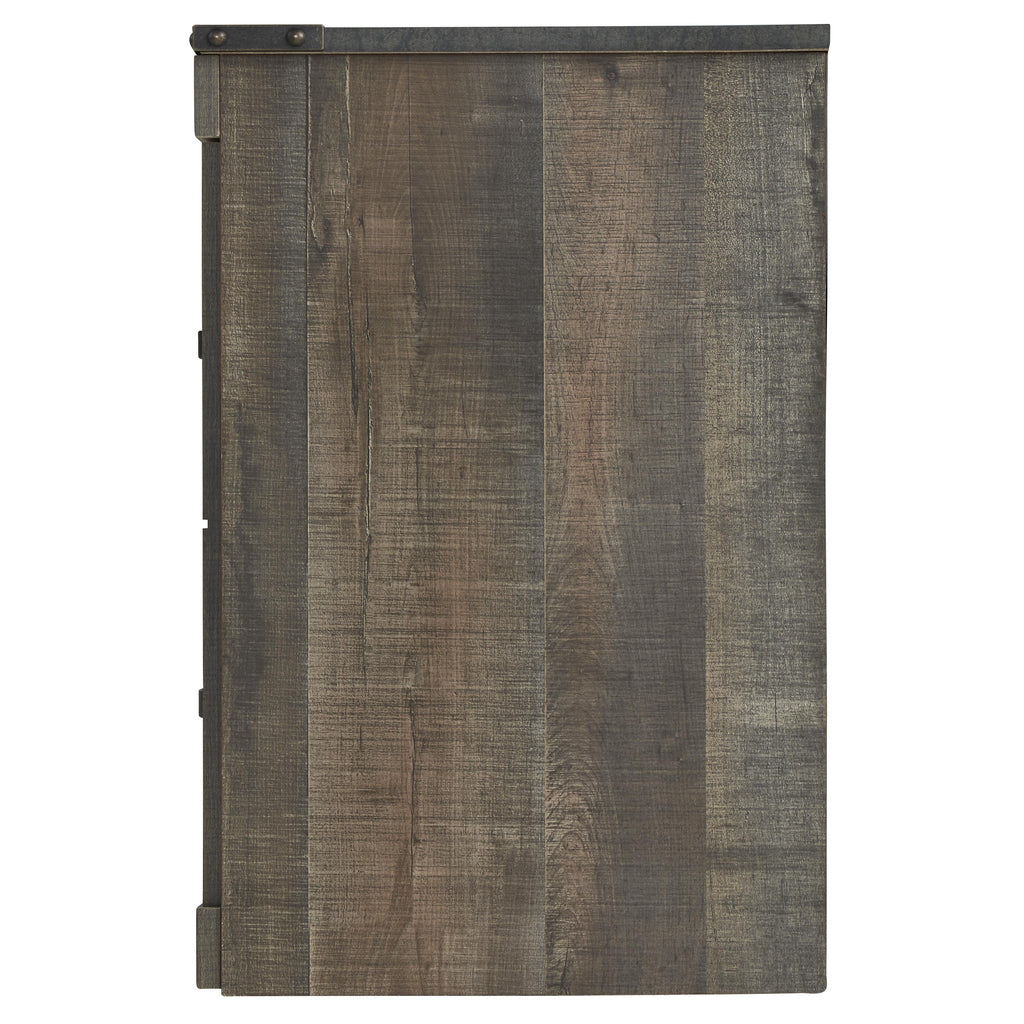 Entertain a rugged-yet-refined sense of style with this TV stand. Its rustic finish and plank-style details pay homage to reclaimed barn wood, while bronze-tone banding with nailhead accents infuses a touch of industrial cool. Ultraclean lines ensure a look that can go from the country to the city and feel equally at home. Opt for the optional fireplace insert (sold separately) for added warmth.