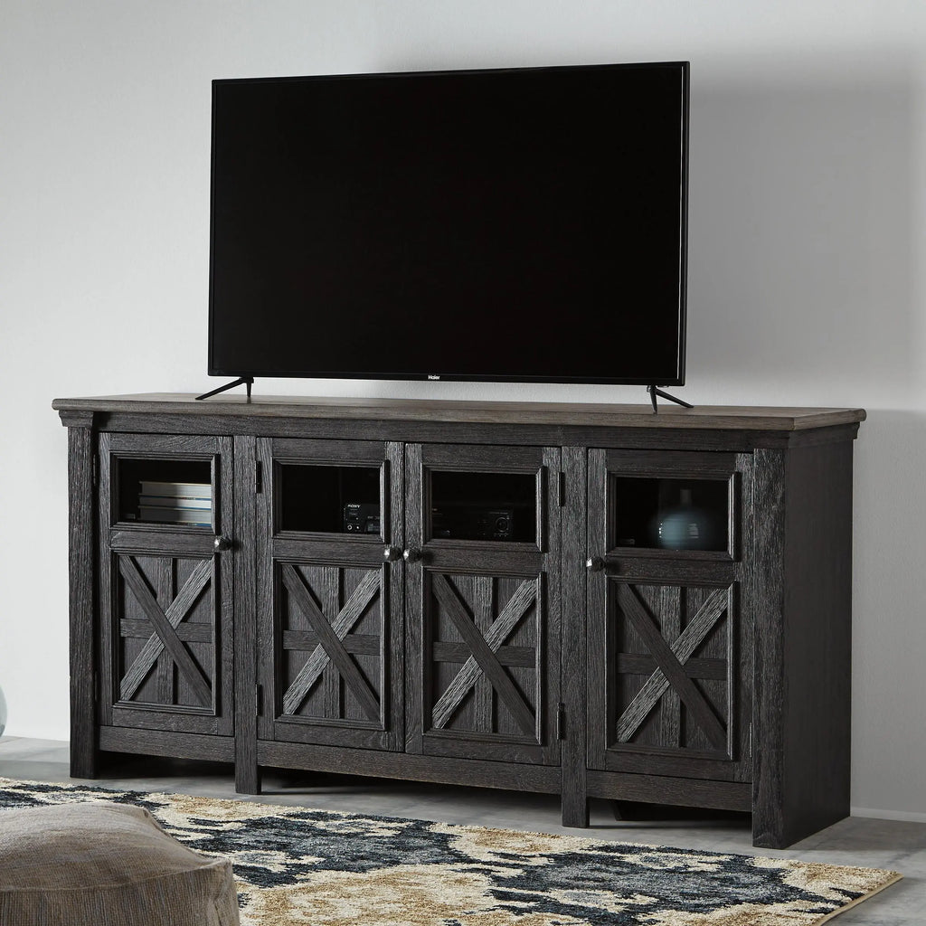 Shabby chic with a hint of down-home country, this TV stand appeals to today’s more relaxed sensibilities. Its richly rustic two-tone effect blends a textured black finish with a weathered gray-brown top for an easy-elegant aesthetic. Framed doors with crossbuck detailing and clear glass insets bring a touch of modern farmhouse to the scene.