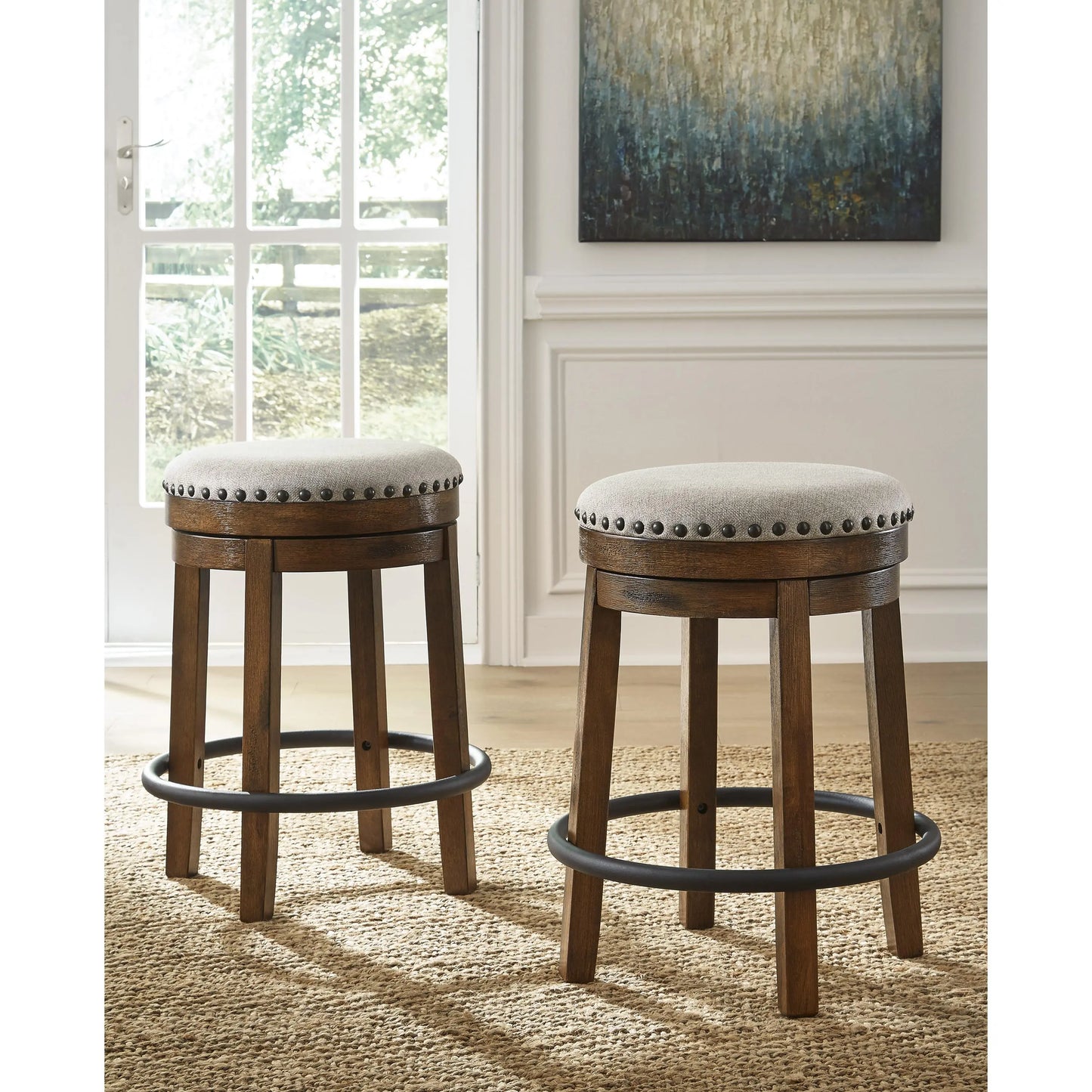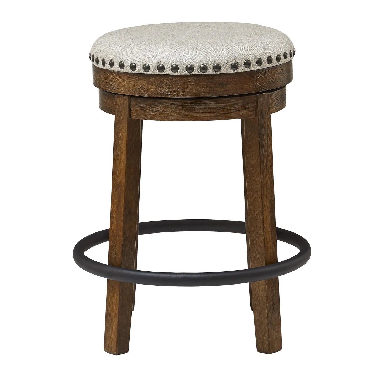 A touch of rustic-industrial style is such a fashion-forward choice, and this swivel stool doesn’t disappoint. Its smooth swivel motion adds function, while nailhead trim brings effortless style. A softly upholstered cushion seat in beige keeps things cozy. Set this stool by the kitchen bar for a visually intriguing mix of new and old.