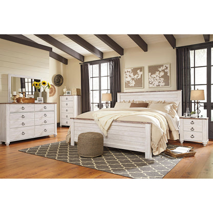 The ultimate look for a beach cottage or shabby chic inspired retreat, the Willowton bedroom set carries you away to a dreamy time and place. Driftwoody whitewashed finish is wonderfully easy on the eyes. Plank-style detailing incorporates a classically rustic touch, so homey and comforting. This set includes a king panel headboard, footboard and rails as well as a dresser, mirror, chest and nightstand.
