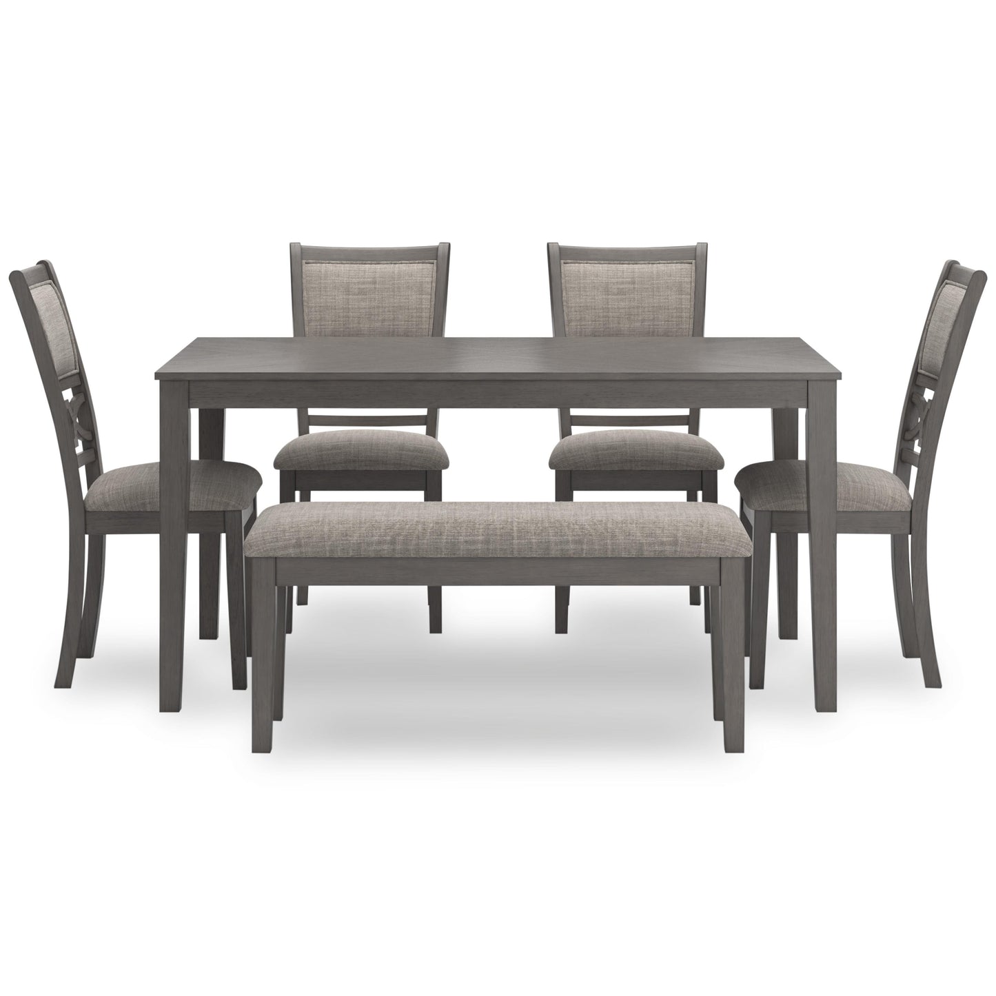 Can’t decide between classic and contemporary? Embrace the beauty of transitional style with this casually sophisticated Langwest dining table, chairs and bench ensemble. A clean-lined profile and modern light gray finish merge with textured upholstery to create a timeless yet on-trend look when guests gather.