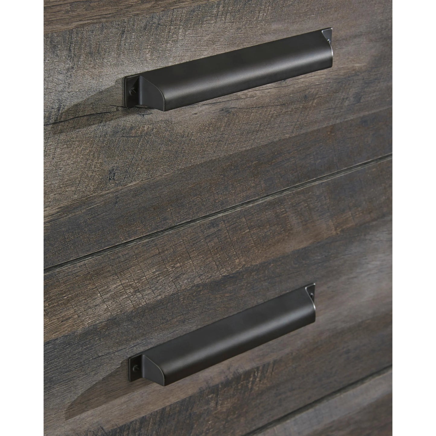 This chest of drawers is sure to win your heart with its daring designer take on modern rustic. The bedroom chest’s crisp, clean and minimalist-chic profile is enriched with a striking replicated oak grain with thick plank styling and a weathered gray finish for that much more authentic character. Large-scale hooded pulls gracing the flush-mount drawers add such a distinctive twist.