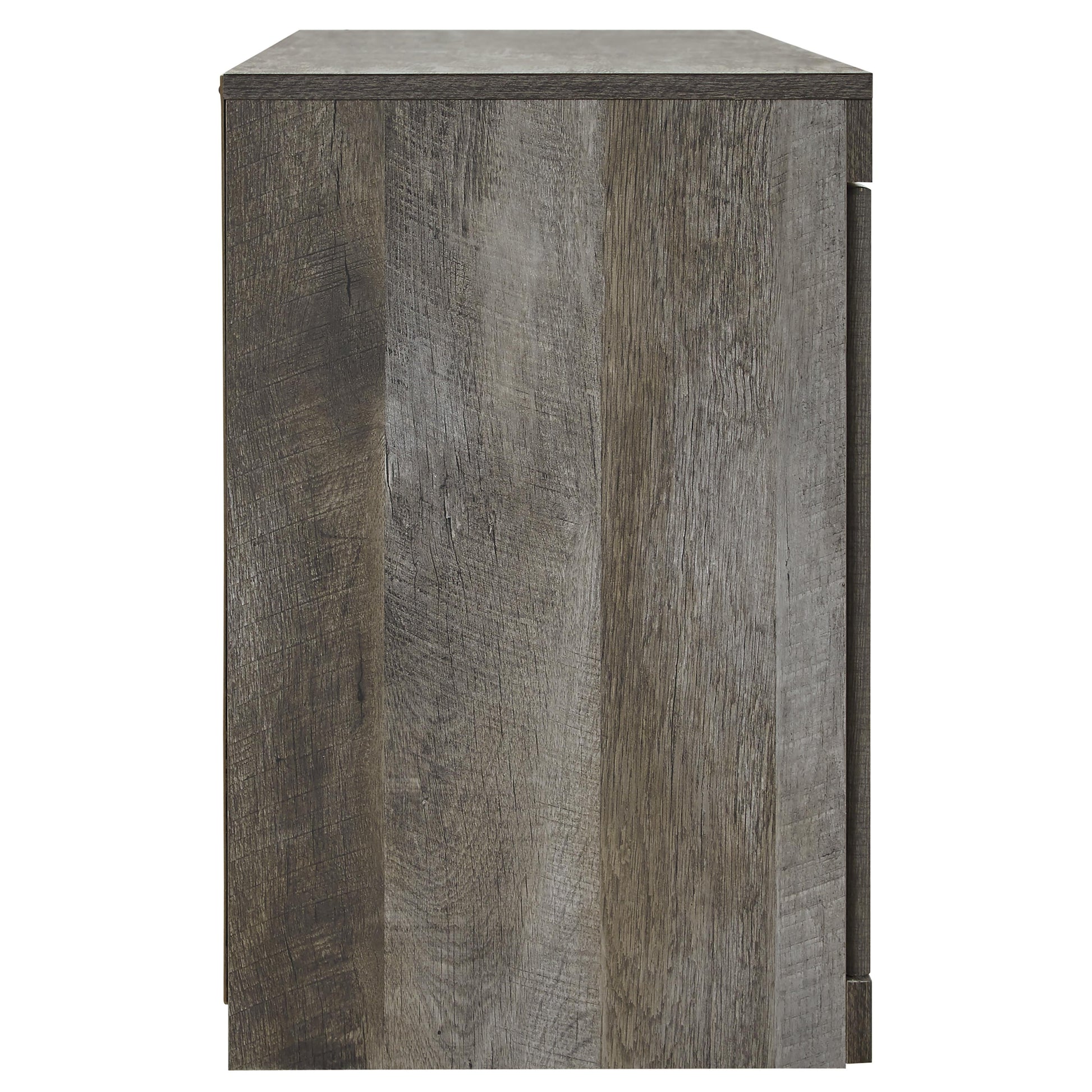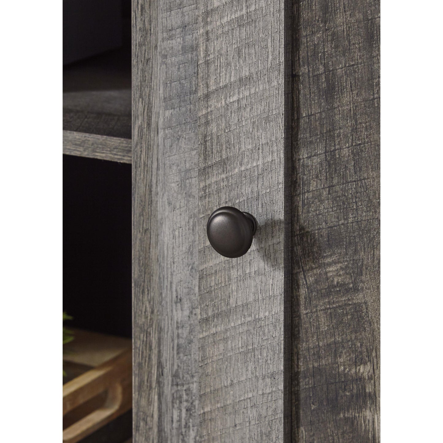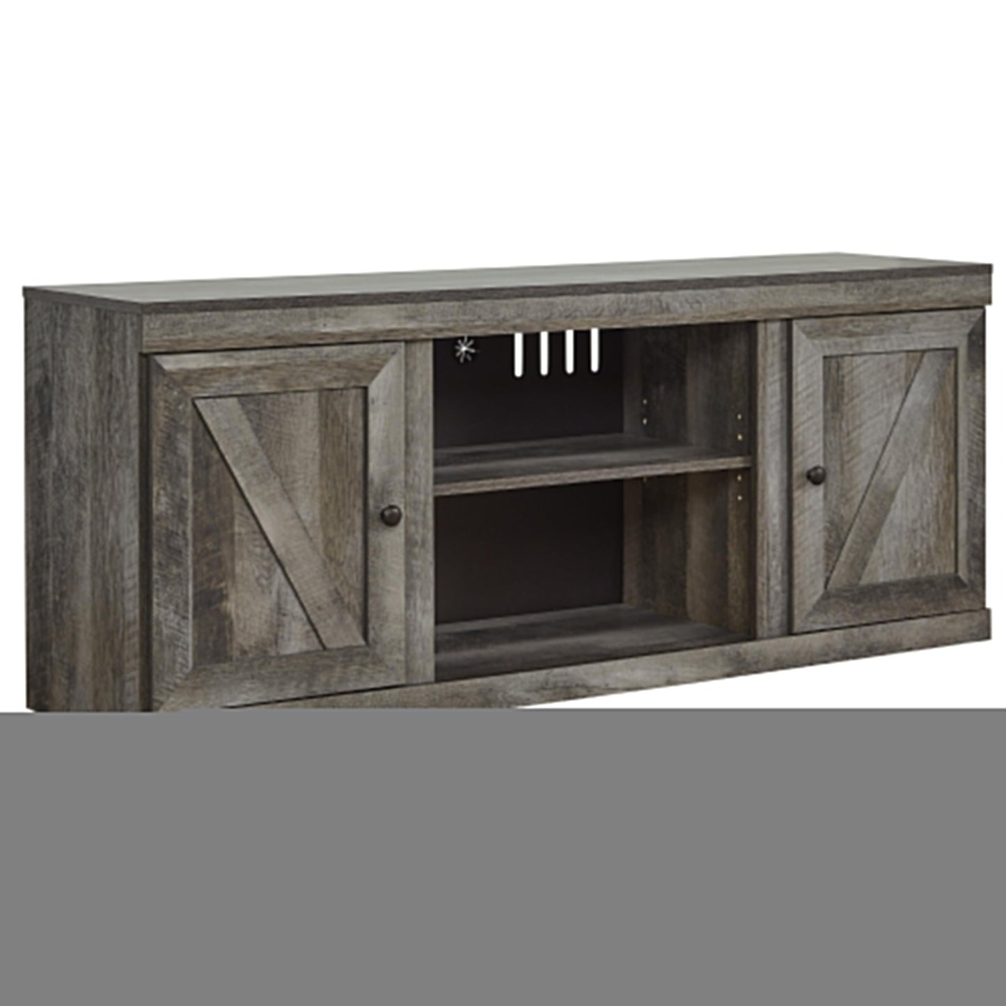This TV stand is sure to win your heart with its daring take on country living. Its crisp, clean minimalist-chic profile is enriched with a gray finish, striking replicated oak grain and thick plank styling for that much more authentic character. Crossbuck detailing adds a brilliant barn door-inspired touch. Opt for the optional fireplace insert (sold separately) for added warmth.
