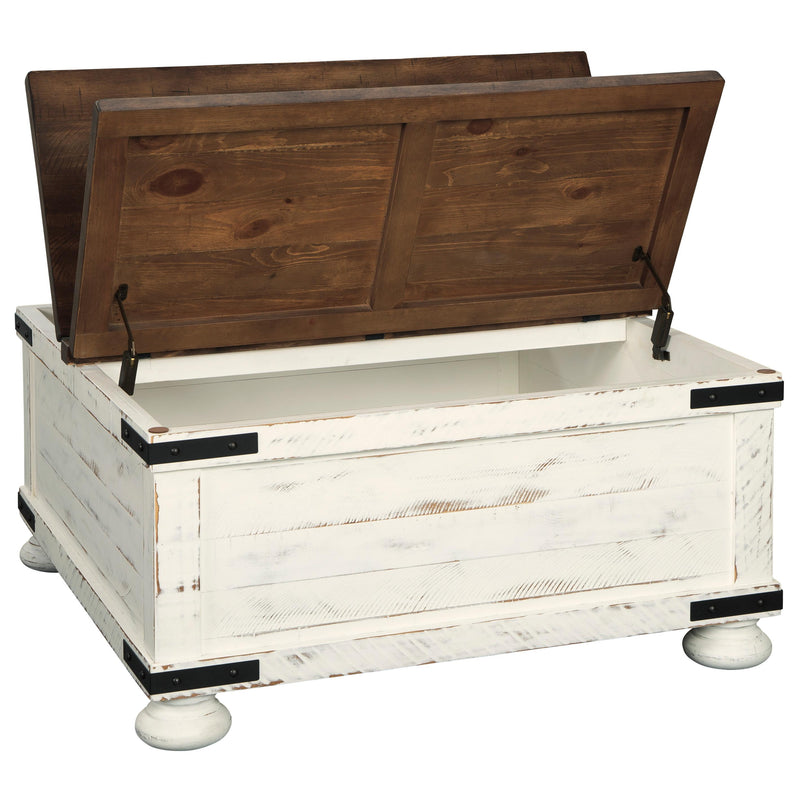 Double take. Sporting a two-tone finish, dual-sided lid design and expansive storage space, this square coffee table takes the art of rustic farmhouse living to a new level. Designer touches include plank-effect styling, heavy distressing and industrial bracket hardware.